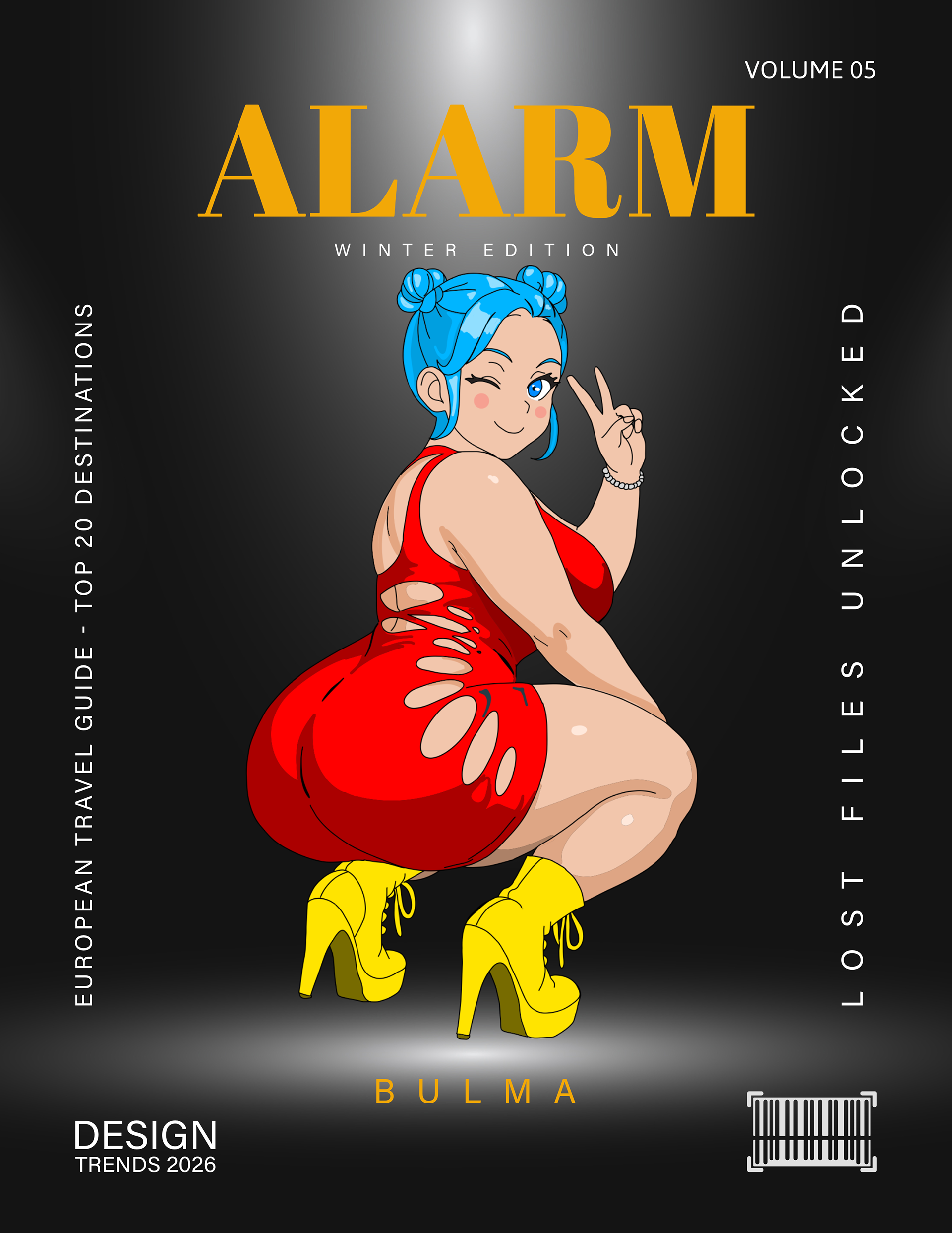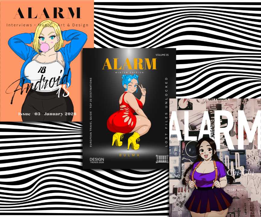 ALARM is a set of fictional magazine cover concepts where I combined bold editorial typography with clean, anime-inspired character illustration. Each cover is built around a “muse” — playful, confident, and stylized — then supported with strong layout hierarchy, punchy color palettes, and graphic backgrounds (zebra pattern + collage textures) to give it that real magazine presence.